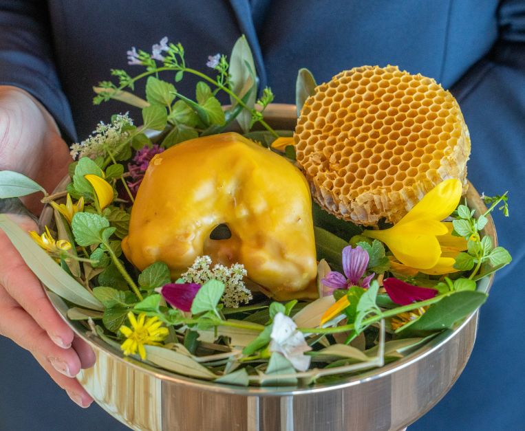 Il piccione allevato da Laura Peri, maturato in cera d’api, è oggi il piatto che definisce questa fase: preciso, elegante, profondo. Il pre-dessert “Rosa” è una dedica alla figlia dello chef, Alice, trentenne che dopo anni come perito chimico e un’esperienza in Australia, ha deciso di rientrare alla base per presidiare l’impresa familiare in qualità di manager. Restando sul dolce, la nuova millefoglie, con la sua sfoglia non caramellata e la bavarese in cornice, chiude il percorso con la delicatezza di una firma. L’ultimo step è la piccola pasticceria, che invita i commensali ad alzarsi e avvicinarsi al carrello dei petit four: una sorta di albero della vita che racconta sogni, desideri e soddisfazioni dello chef. Il concetto prende forma attraverso diversi elementi simbolici: le radici, interpretate come liquirizia glassata al cioccolato fondente; il seme, rappresentato dalla mandorla; il fiore, evocato dall’uso dell’ibisco.