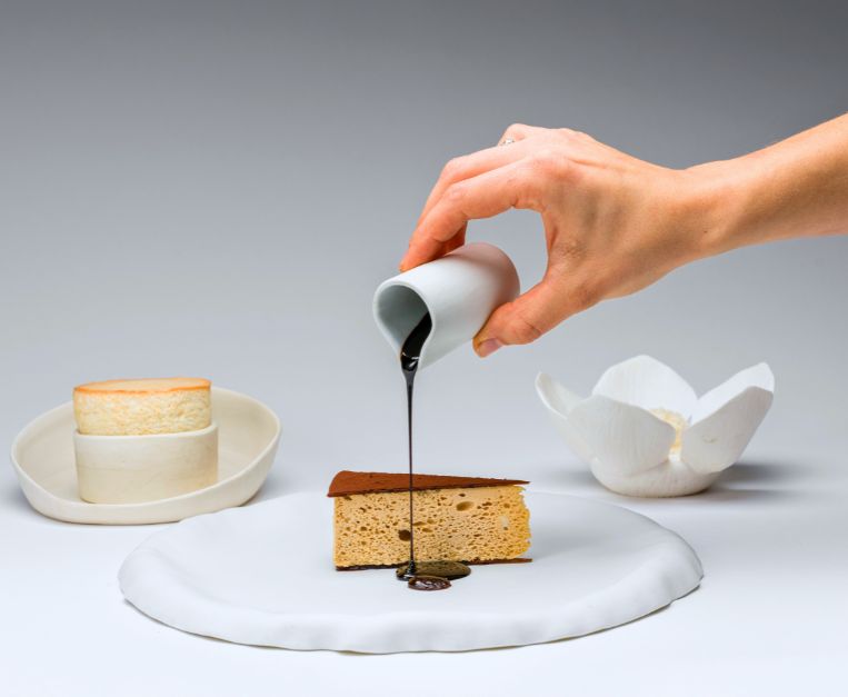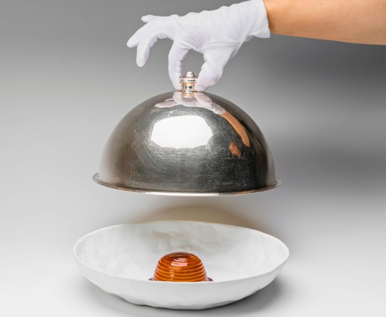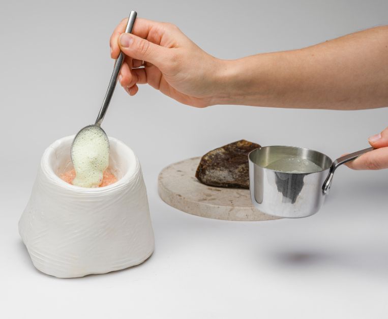 Un “piatto” a forma di dente accoglie la tappa più sorprendente del percorso: un chawanmushi (flan giapponese) di vongole e cuore di tonno essiccato come una bottarga, condito con finger lime e caviale e completato da aria di prezzemolo e vongole.