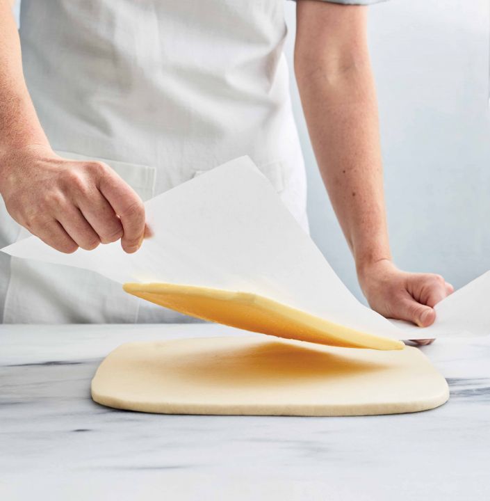 2. Mettete il burro freddo rimanente tra 2 fogli di carta forno e lasciatelo riposare a temperatura ambiente per 10 minuti. (A) Usando un mattarello, battete il burro per appiattirlo e ammorbidirlo leggermente. Rimuovete e sostituite la carta forno se necessario. Utilizzando un tarocco e un mattarello, modellate il burro, formando un panetto quadrato da 20 cm. Refrigeratelo, sempre tra i fogli di carta forno, per 15 minuti.