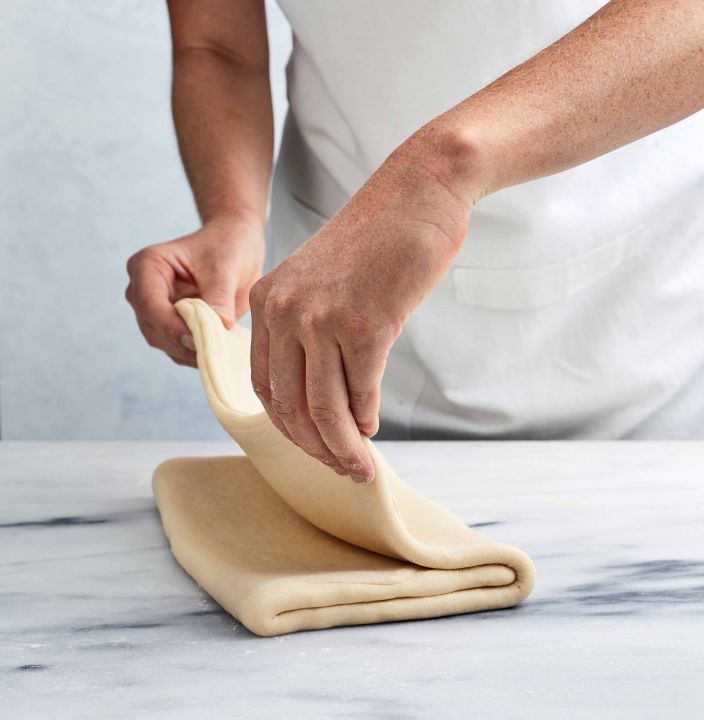 5. Infarinate leggermente il piano di lavoro se necessario. (F) Premete il mattarello sull’impasto a intervalli regolari in modo da creare degli avvallamenti, distribuendo in modo uniforme il burro. Stendete la pasta in un rettangolo da 60 x 30 cm. (G) Partendo da un lato corto, piegate la pasta in tre parti, come un portafoglio. Trasferite l’impasto su una teglia leggermente infarinata. Coprite bene con pellicola alimentare e refrigerate finché non si rassodi, per circa 45 minuti. Ripetete il processo di stesura, piegatura e raffreddamento altre 2 volte. Procedete con la preparazione dei croissant classici.