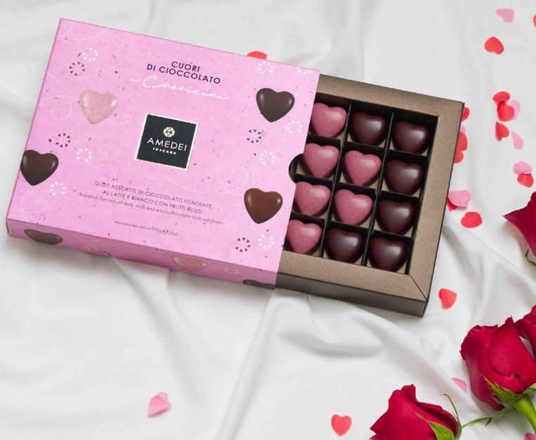 L’azienda di cioccolato toscana celebra la festa degli innamorati con un formato semplice e immediato: cuoricini assortiti in due box (da 20 e da 9). Tre anime: fondente 70% per chi cerca intensità, latte per morbidezza e complicità, bianco ai frutti rossi per una nota fresca e rosa, quasi “flirt”. Il messaggio è tutto nella cura: filiera, lavorazione e attenzione alla materia prima, per un regalo che punta sull’essenziale.