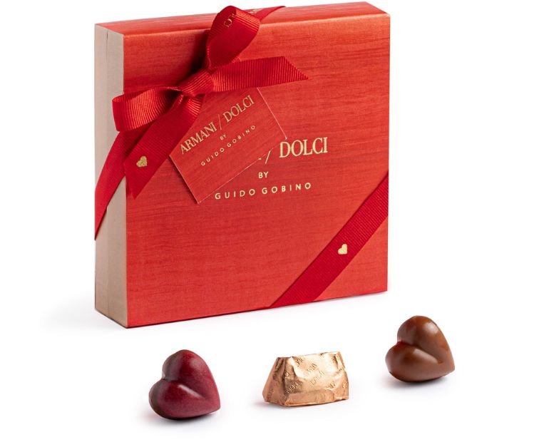 La tradizione dolciaria torinese interpretata dallo stile Armani quest’anno veste San Valentino con un’eleganza grafica netta: rosso intenso, venature “onice”, logo in oro a rilievo e nastro gros grain. Dentro, due nuovi cioccolatini a cuore (bistrato amarena + fondente 75% oppure gianduia pralinato) e un grande cuore cavo al latte o fondente 63% con dragées assortiti. Disponibile nelle boutique selezionate e online.