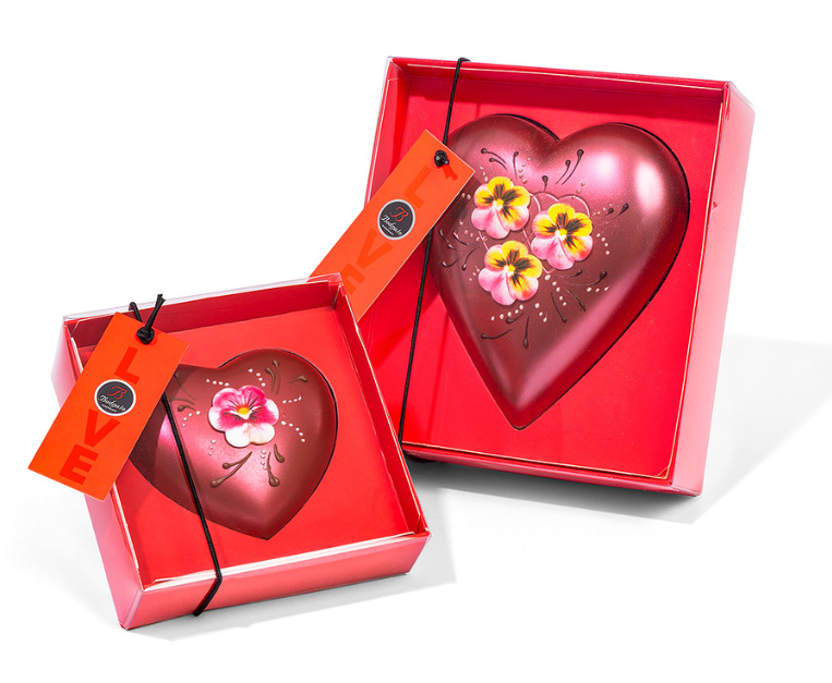 Specializzata nella produzione di boeri e cuneesi, come vuole la tradizione piemontese, questa fabbrica di cioccolato artigianale conferma il cuore come forma iconica del suo San Valentino. Bodrato Cioccolato lo fa partendo dall’essenziale: stampi di cioccolato al latte o fondente, decorati con viole del pensiero, fiore tradizionalmente legato al ricordo e al messaggio che comunica amore e fedeltà. Disponibili da 80 o 200 grammi.