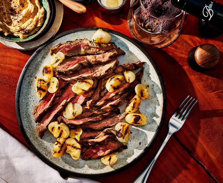 Skirt steak alla griglia con cipolle borettane, burro al limone e alga nori
